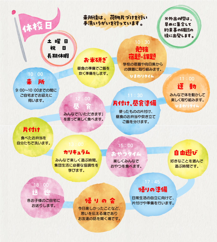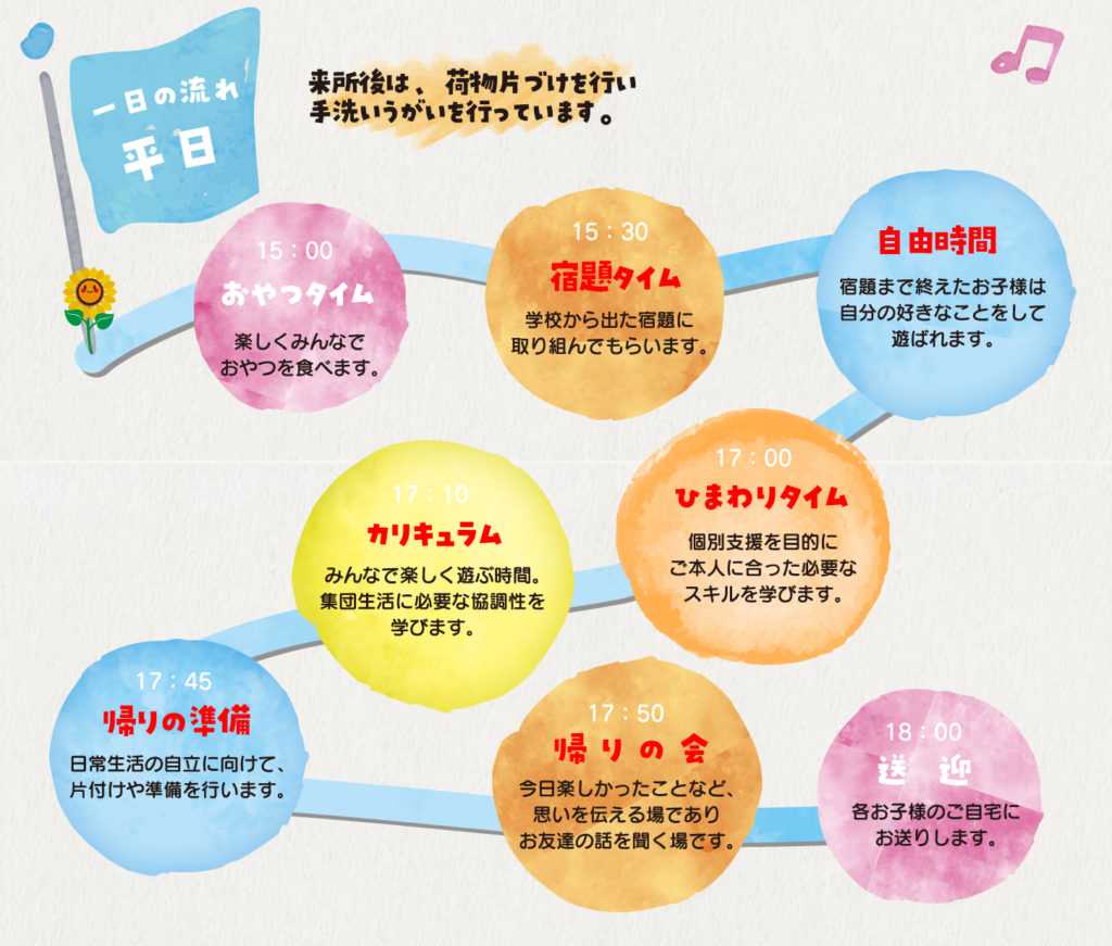 放課後等デイサービスは、障がいのある(療育が必要と認められる)お子さまの学齢期における支援 の充実のため創設されました。障がい児の学童保育と表現するとわかりやすかもしれません。